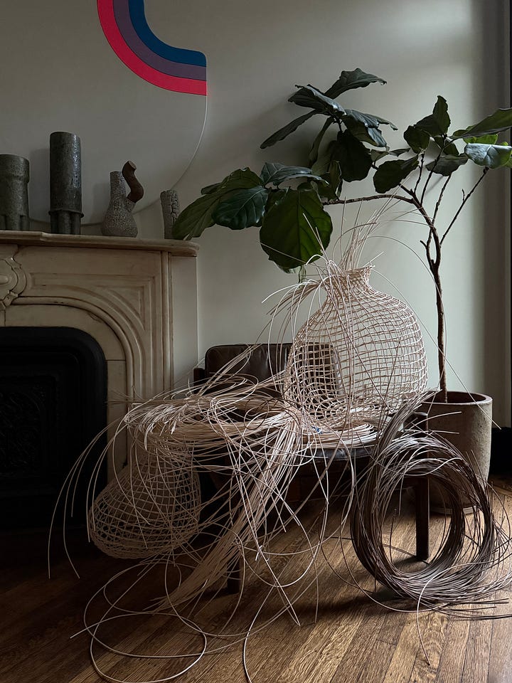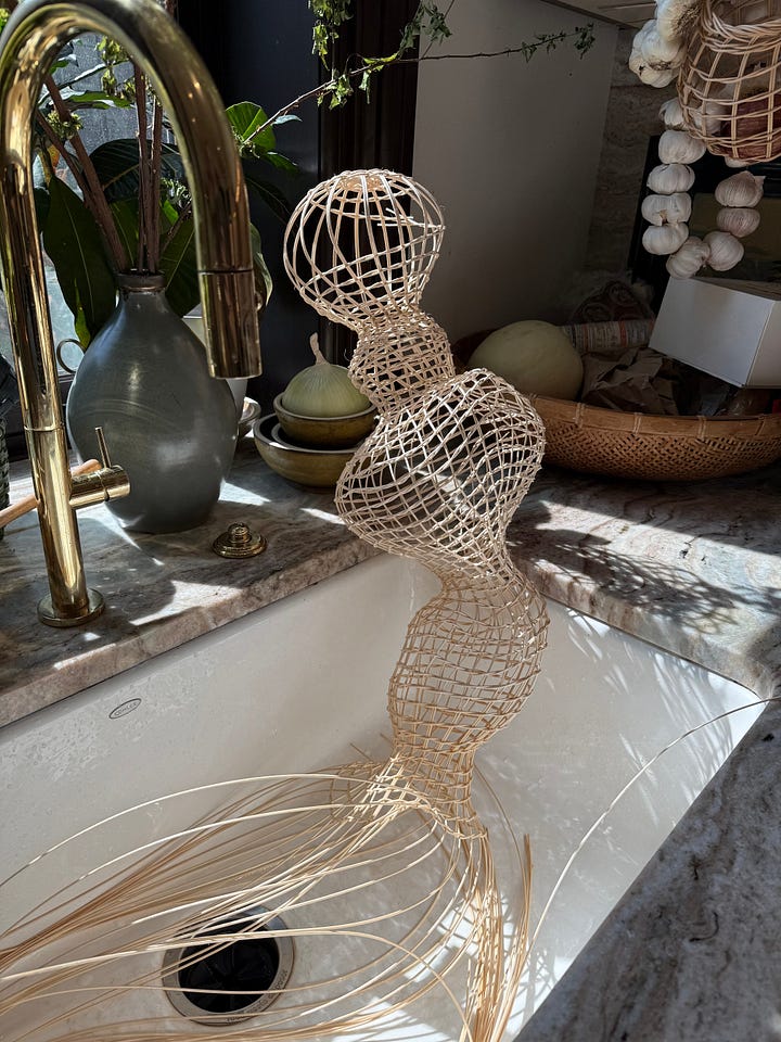 People often ask about the name of the studio. “Underwater Weaving” takes its title from the literal, necessary process of soaking natural materials to make them supple enough to shape. It’s also a nod to the cultural idiom so often used to dismiss domestic labor, women’s work, and vocational learning. How appropriate that men would find feminine nurturing so threatening to discard it as useless. Underwater Basket Weaving became shorthand for “not smart.” I chose to embrace the phrase to turn a joke into a statement. I believe deeply that softness, slowness, and beauty are sources of immense power. I feel liberation in my choice to gather, make, nurture, and give.