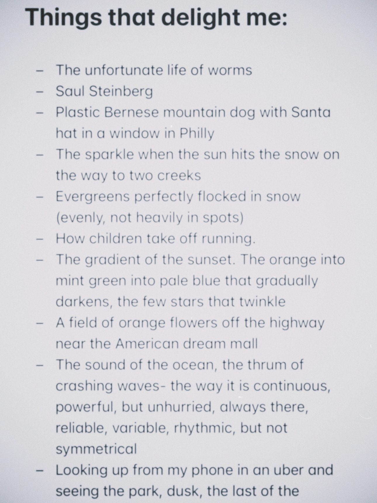 All the delights of life—when you slow down and pay attention. I keep a list: