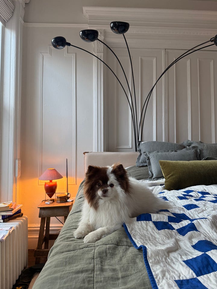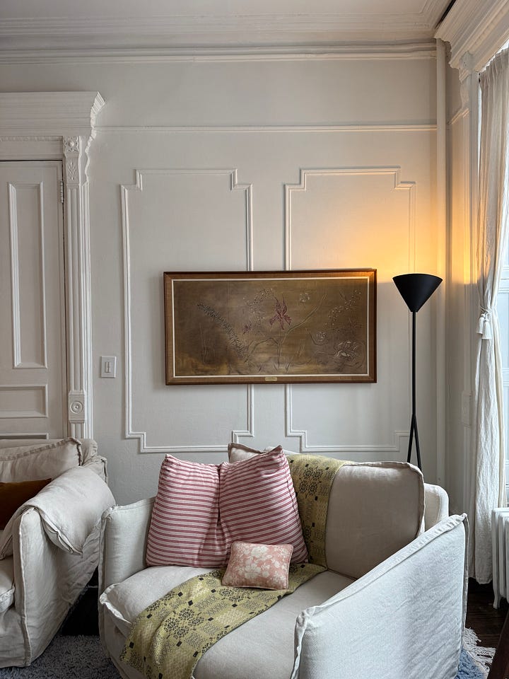 That bedroom mural was filled with deep greens and soft pinks, and it’s something that still translates into how I design my home today. While I love simplicity and plenty of white space, I’m always drawn to the warmth of maximalism and color. Our living room has two baby-blue rugs pushed together to create an extra-large rug, which is one of my most asked-about pieces. It creates the most beautiful balance against our crown-molded white walls.