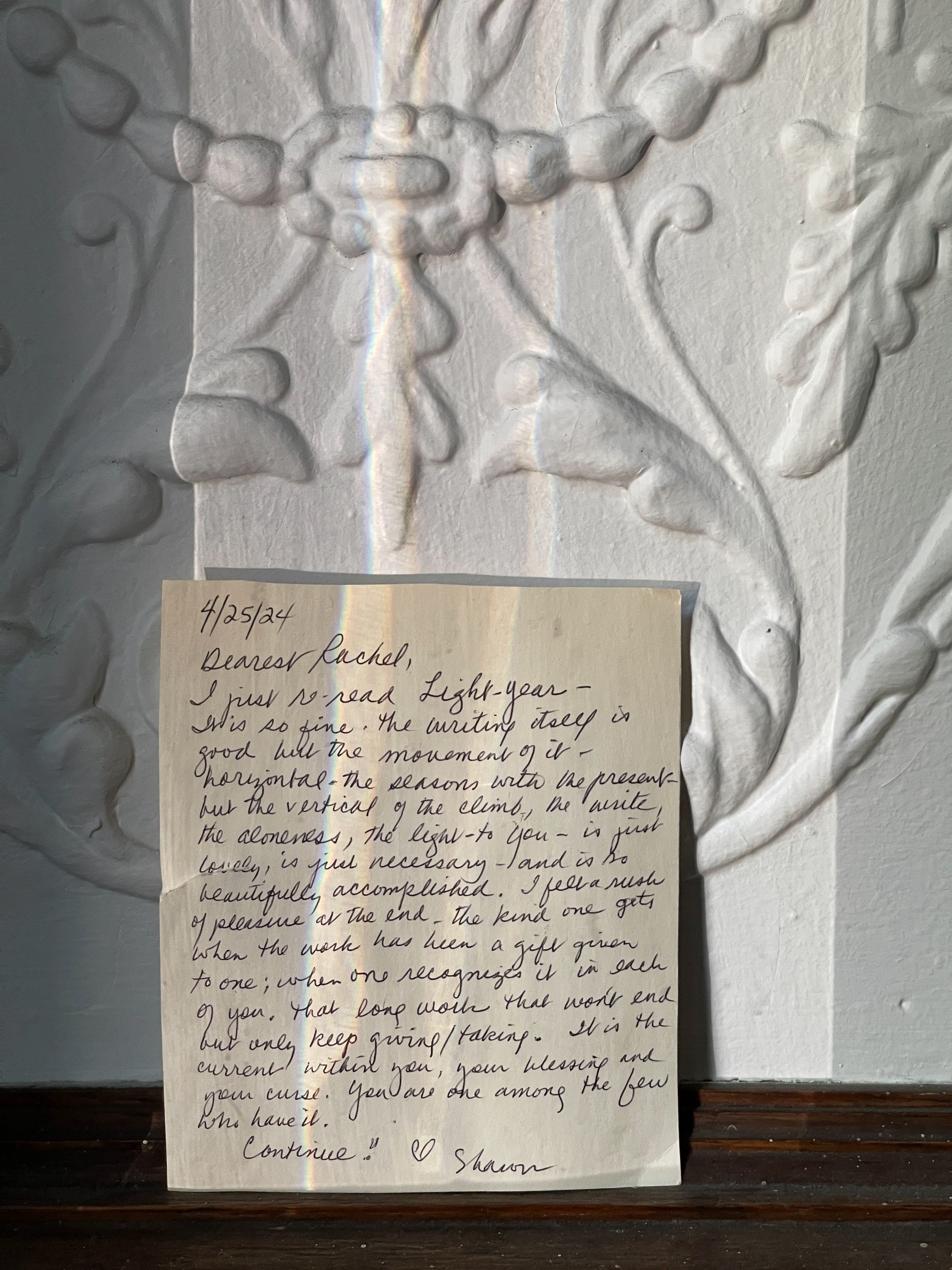 “I know I feel surrounded by friends in the paintings that hang around me,” Sharon writes in one of her recent letters. “And when you find good sentences, do you feel they came from another part of you? A part in connection to you, a part you need to summon?”