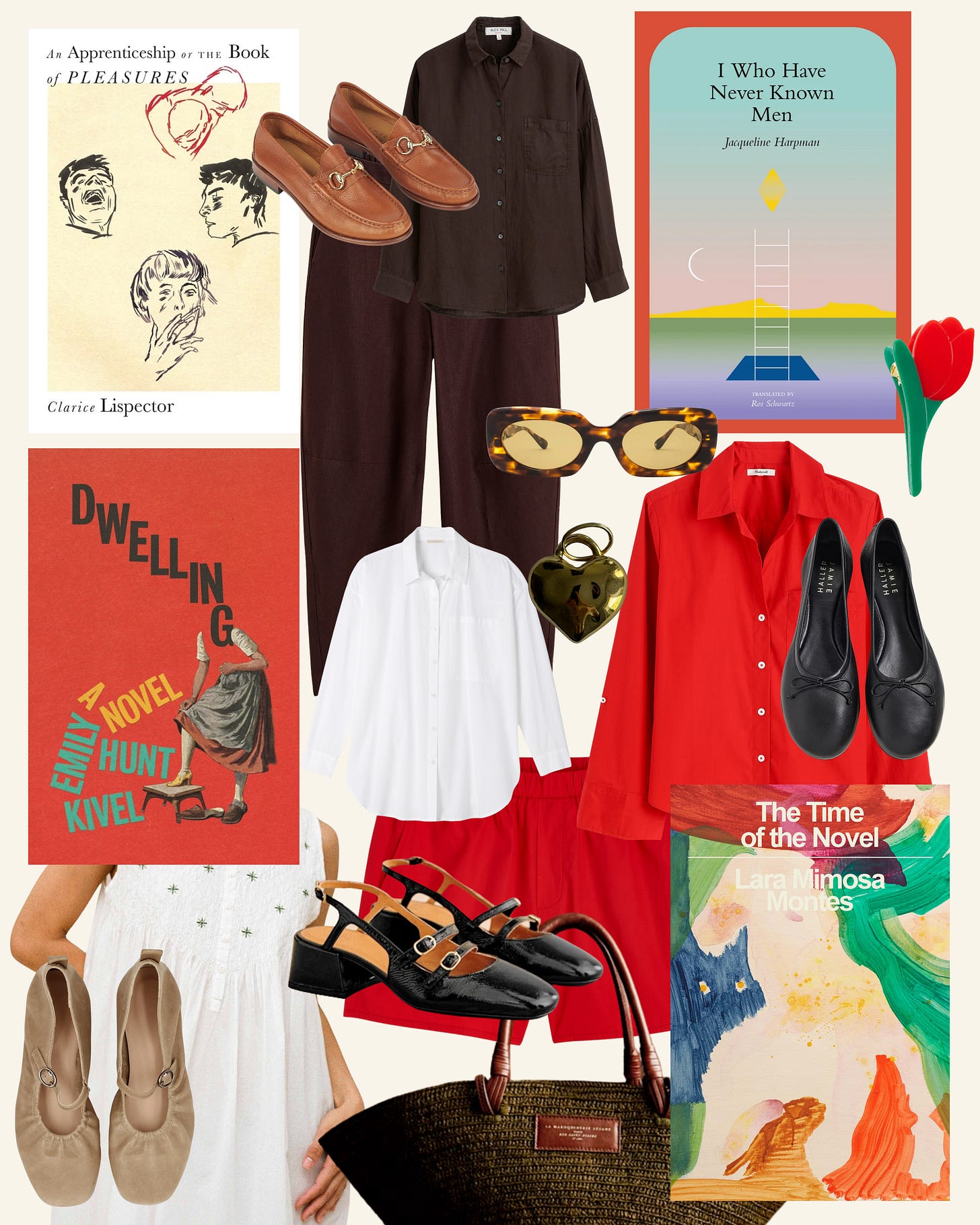 Alex Mill Jo Shirt in Dark Brown Linen - Aperçu Alyssa Sunglasses in Vintage Tort - EILEEN FISHER Washed Organic Cotton Poplin Classic Collar Long Shirt - Either/Or Mary Jane - Jamie Haller Ballet Slippers - Jamie Haller Bit Loafers - Loeffler Randall Juniper Multi Tulip Clip Set - *Madewell Linen Pull-On Barrel Pants -*Madewell Poplin Easy Button-Up - *Madewell Pull-On Shorts - Salter House Anise Nightdress - *Sézane Irma Charm - Sézane Justine Basket Bag - Sézane Paula Babies Heels